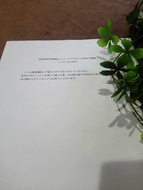本日より 教室の向上の為にアンケートにお応えいただきたく、用紙を配布させていただきます。 レッスンを受けていただき感じた事。 こんな風にしてほしいとのご要望。 レッスンを受けたお子様の様子、変化などお聞かせくださいませ。 お子様からのメッセージもお待ちしております。
