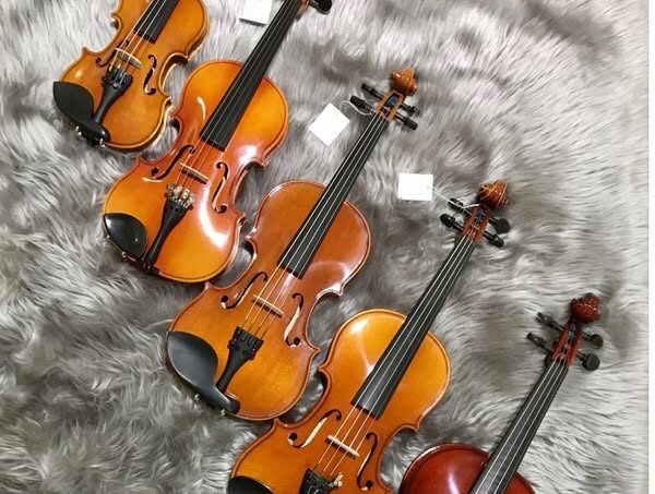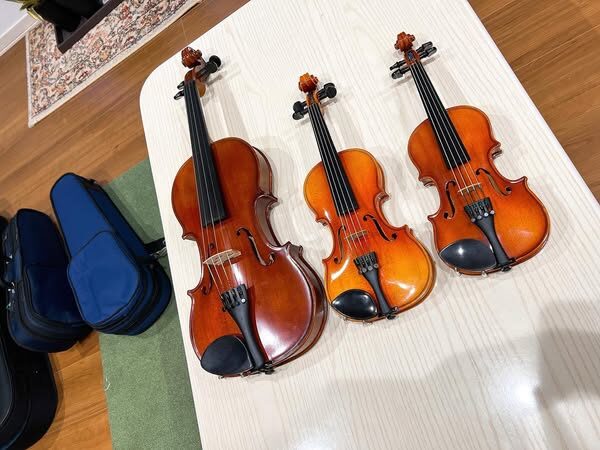 ヴァイオリン体験レッスンに使うレンタルヴァイオリンを並べてみました。16分の110分の14分の4を並べるとこの様にお写真より実物の16分1サイズは可愛いサイズです。お子様の体格に合わせてヴァイオリンをレンタルでき、サイズ変更しても料金は変わりませんので安心です。 ヴァイオリン並べてみました ヴァイオリン体験レッスン