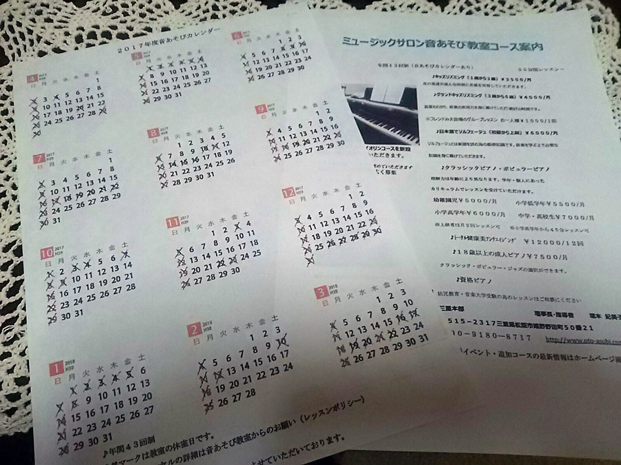本日より 1.来年度の音あそびカレンダー 2.コース案内 3.音あそび教室からのお願い (レッスンポリシー) を配布させていただきます。 1.のカレンダーは五線紙に貼らせていただきます。 来年度の曜日と時間を記入してございま す。必ずご確認ください。 2.3は変更ございませんが、今一度ご確認くださいますよう宜しくお願い致します。