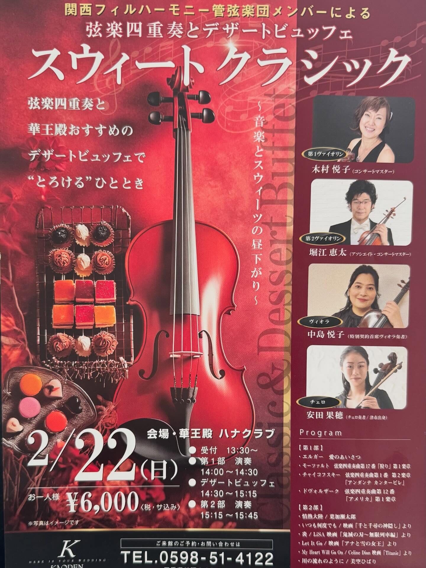 華王殿様よりアフタヌーンティーコンサートのお知らせをいただきました。チラシ、詳細は華王殿様に直接お問い合わせくださいませ。私も伺う予定ですので、コンサートとデザートビュッフェどちらも楽しみしております